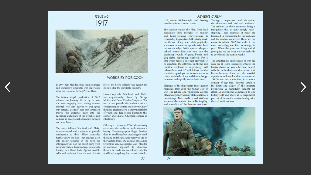I undertook the reviewing of Sam Mendes film 1917 for the Tempus Magazine, an arts and lifestyle magazine based in Brighton. The link to the issue in question is here.